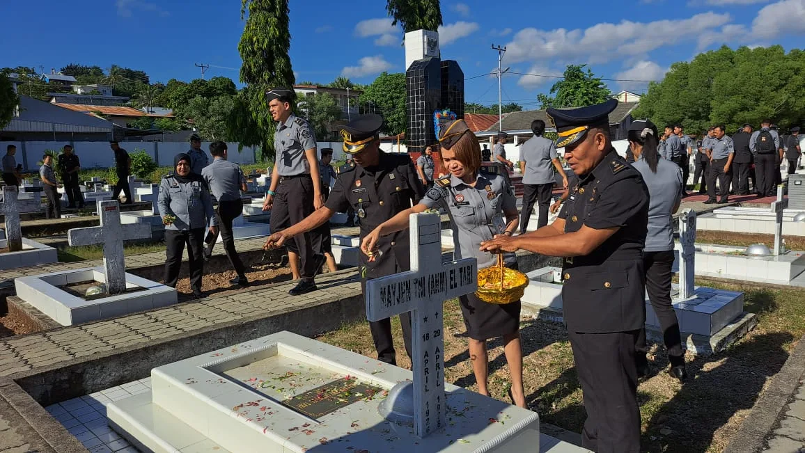 NewsIndonesia - Dalam rangka memperingati Hari Bakti Pemasyarakatan (HBP) ke-60, jajaran Rumah Penyimpanan Benda Sitaan Negara (Rupbasan) Kelas I Kupang mengikuti Upacara Tabur Bunga di Taman Makam Pahlawan (TMP) Dharma Loka, Kamis (25/04). Kegiatan ini diselenggarakan oleh Kantor Wilayah (Kanwil) Kementerian Hukum dan Hak Asasi Manusia (Kemenkumham) Nusa Tenggara Timur (NTT) dan turut diikuti seluruh Unit Pelaksana Teknis (UPT) Pemasyarakatan dan Imigrasi se-Kota Kupang.